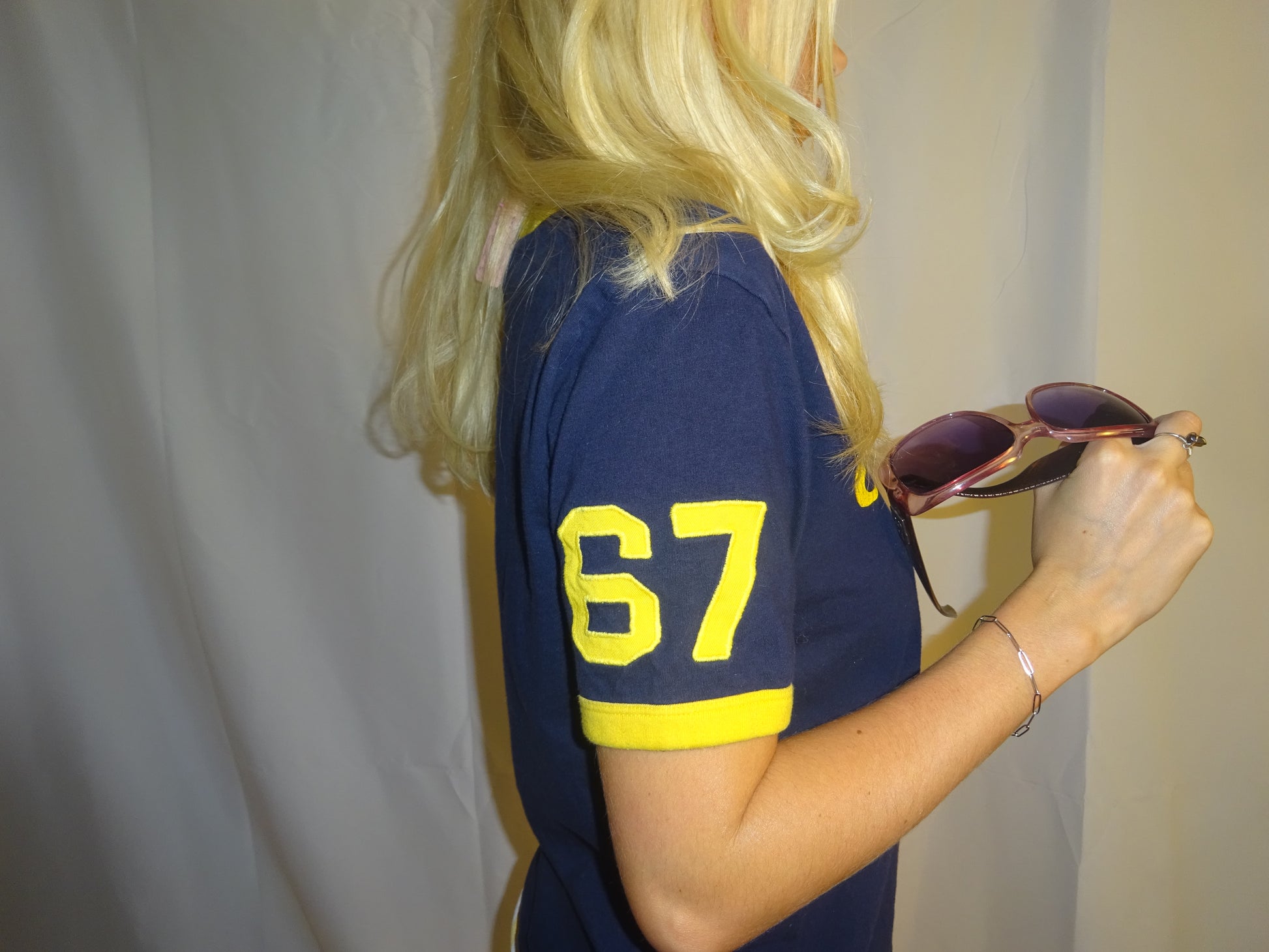 I have this t-shirt tied up with a ponytail in the first three pictures. The size is a youth large, but you can customize the size by tying it:))))))