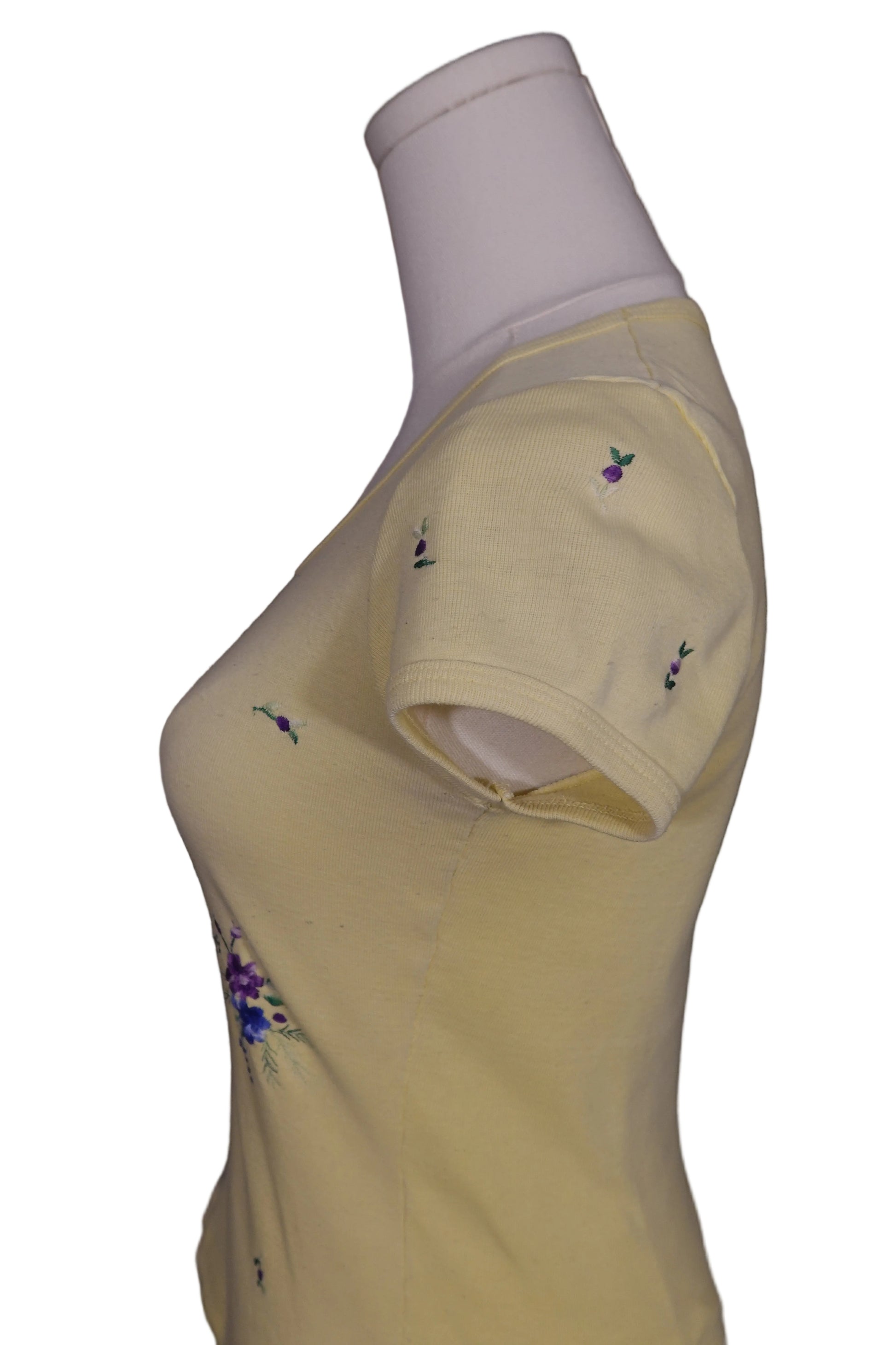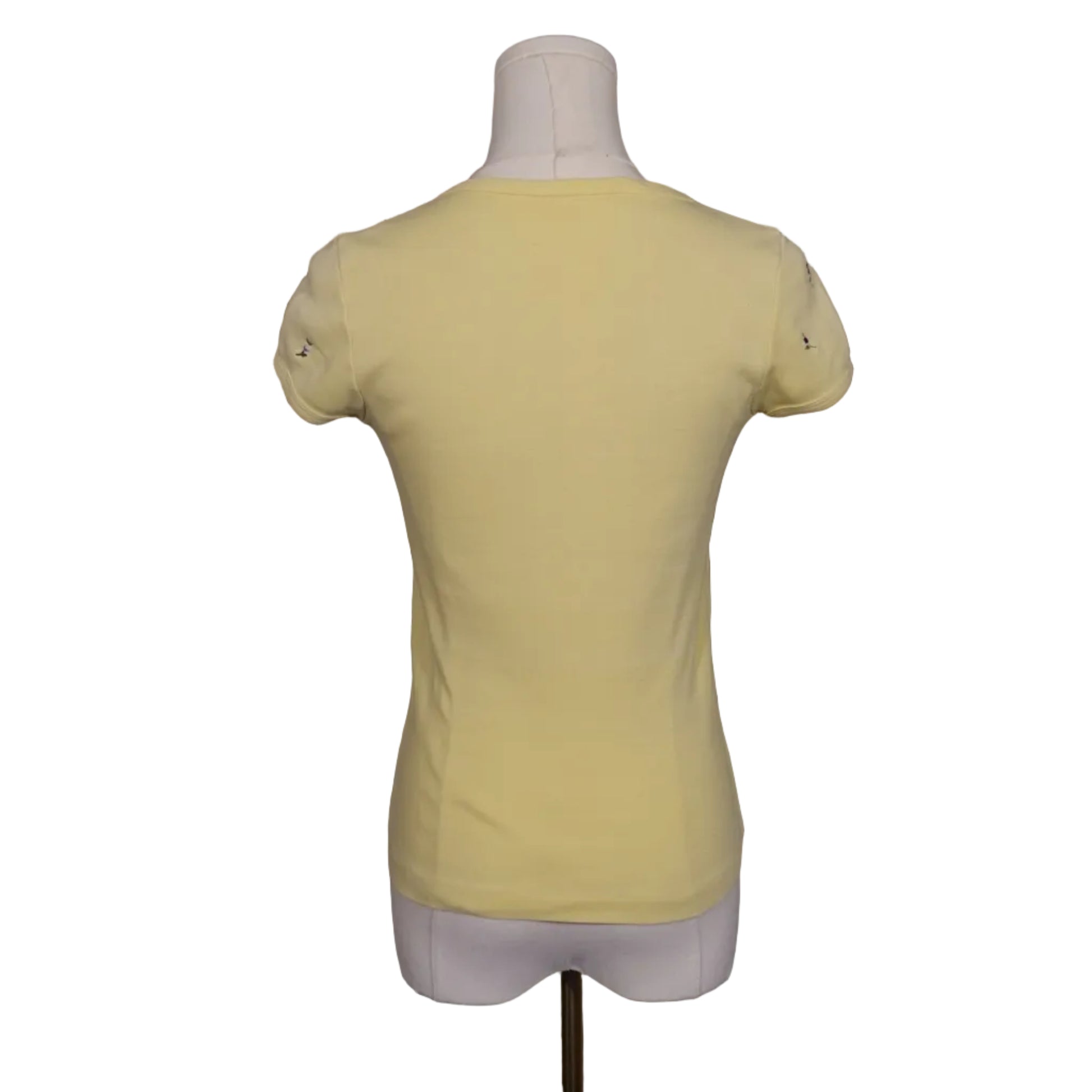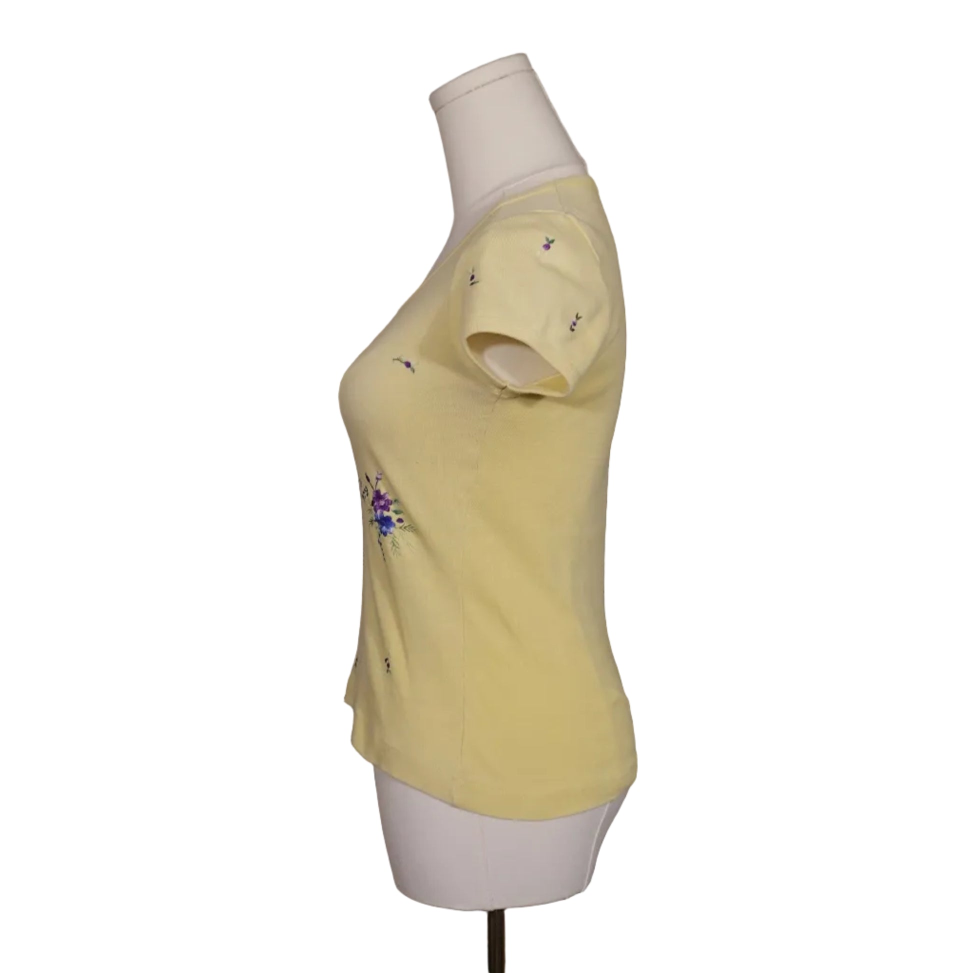 Details: Soft yellow cotton-blend fabric, all-over mini floral print, scoop neckline, short sleeves, fitted baby-tee silhouette.